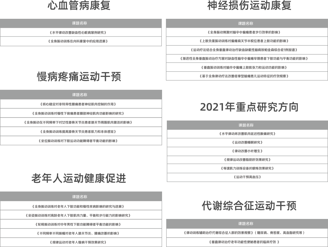 华山医院、上海市同济医院、北京301医院、北京大学医学院、江苏省人民医院等多家机构展开大量的临床研究。目前,已经在CNS & Neurological Disorders - Drug Targets、MedSci、Bone、中国康复医学、中国组织工程等国内外核心期刊发表24篇研究报告,研究成果转化为代谢综合征运动干预、便秘运动干预、静脉曲张运动干预、痔疮运动干预、睡眠障碍运动干预、脑卒中术后康复运动干预等适宜技术,在尚体乐活空间,福苑、慧享福等养老机构,华山医院、江苏省人民医院等医疗机构应用与推广。